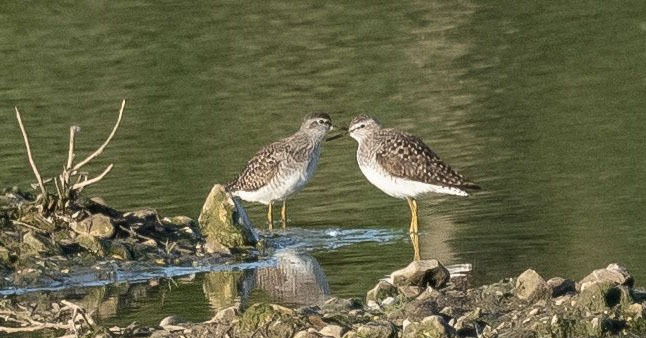 Beddington Farmlands: 2 Wood Sandpipers on Wet Grassland; also 4 Wheatears and Common Sandpiper (D Bulling/G Howgate/I Jones/A Ramesh).