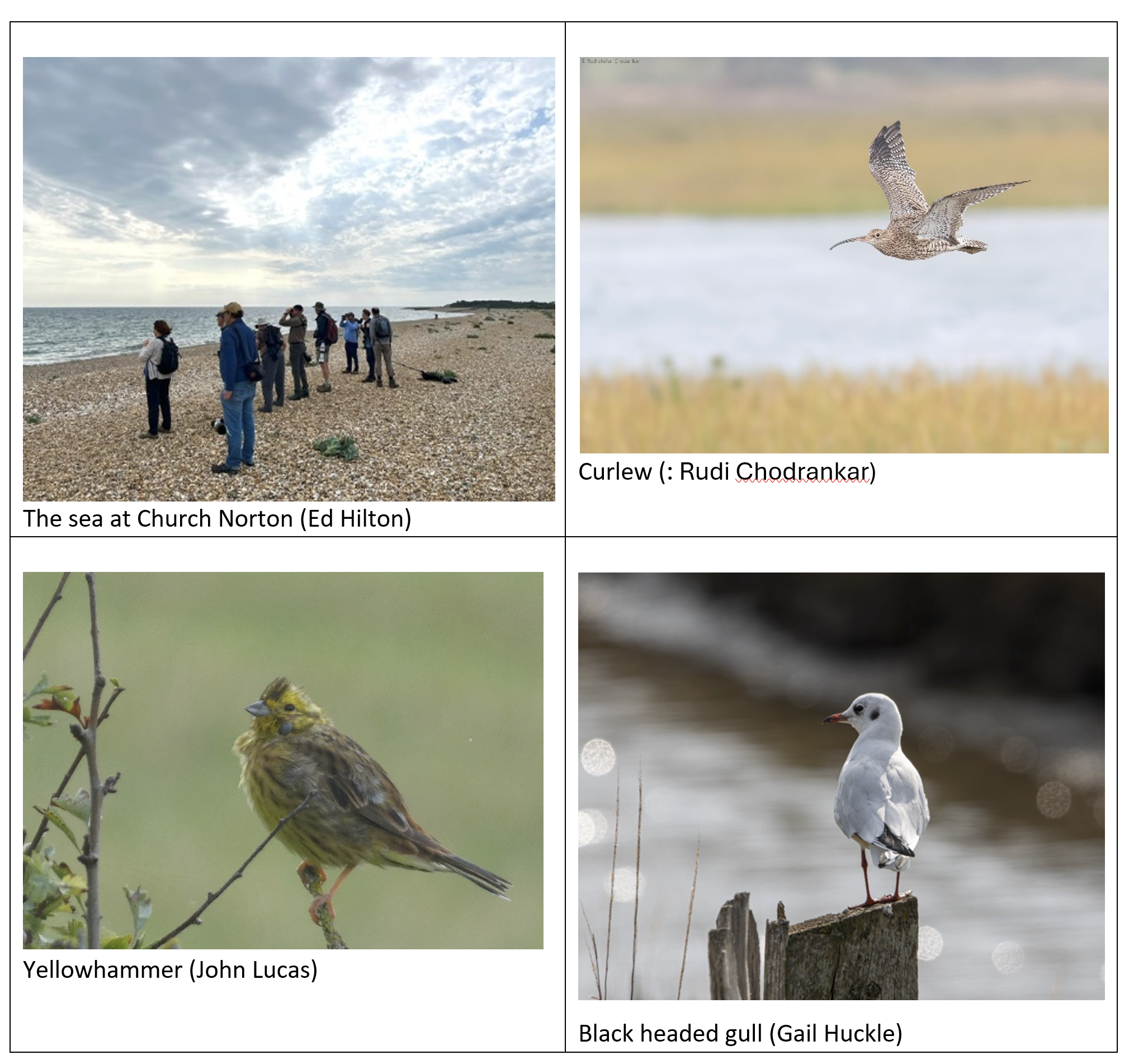 Up the west path, seeing farmland birds on one side (Wheater, Stonechat, Meadow Pipit, Raven, Red-legged Partridge and superbly plumaged Yellowhammers – one of the star birds of the trip) and estuarine on the other (Pintail, Wigeon, Shelduck, Redshank, Dunlin, Curlew) until we reached the shingle spit at Church Norton. With the tide out the mudflats were attracting a huge variety of birds with a chance to identify Mediterranean from Black-headed Gulls, Whimbrel from Curlew and Bar-tailed from Black-tailed Godwits.