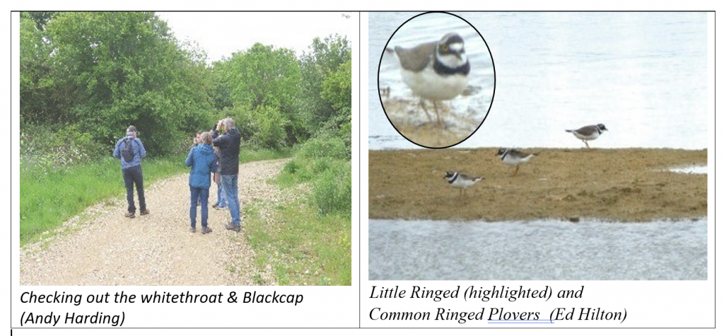 We were lucky that it was a bright sunny day for our first field trip of 2021 after the earlier lock down. 18 of us gathered near the Aqua Sports centre of Mercers’ lake and formed 3 groups led by experienced birders: Ian Kehl, Gordon Hay and Andy Harding. While we waited for everyone to arrive, Gordon spotted a Lapwing high overhead. Setting off towards Spynes Mere, we crossed Mercers Farm hearing Blackcap in the hedges to our left, and seeing a pair of Egyptian Geese ahead on the grass; a Little Owl was glimpsed in an oak tree. As we approached Spynes mere a pair of Sparrowhawks gave good overhead views on several occasions, at one point landing on a nearby tree. Looking across the mere,numbers of Sand Martins (up to 30) were seen flying low over the water, no doubt attracted by the sand banks at the far end. Some of the groups did a circuit of the mere at this point spotting Reed Bunting, Teal and Greenfinch, and hearing Cetti’s Warbler.