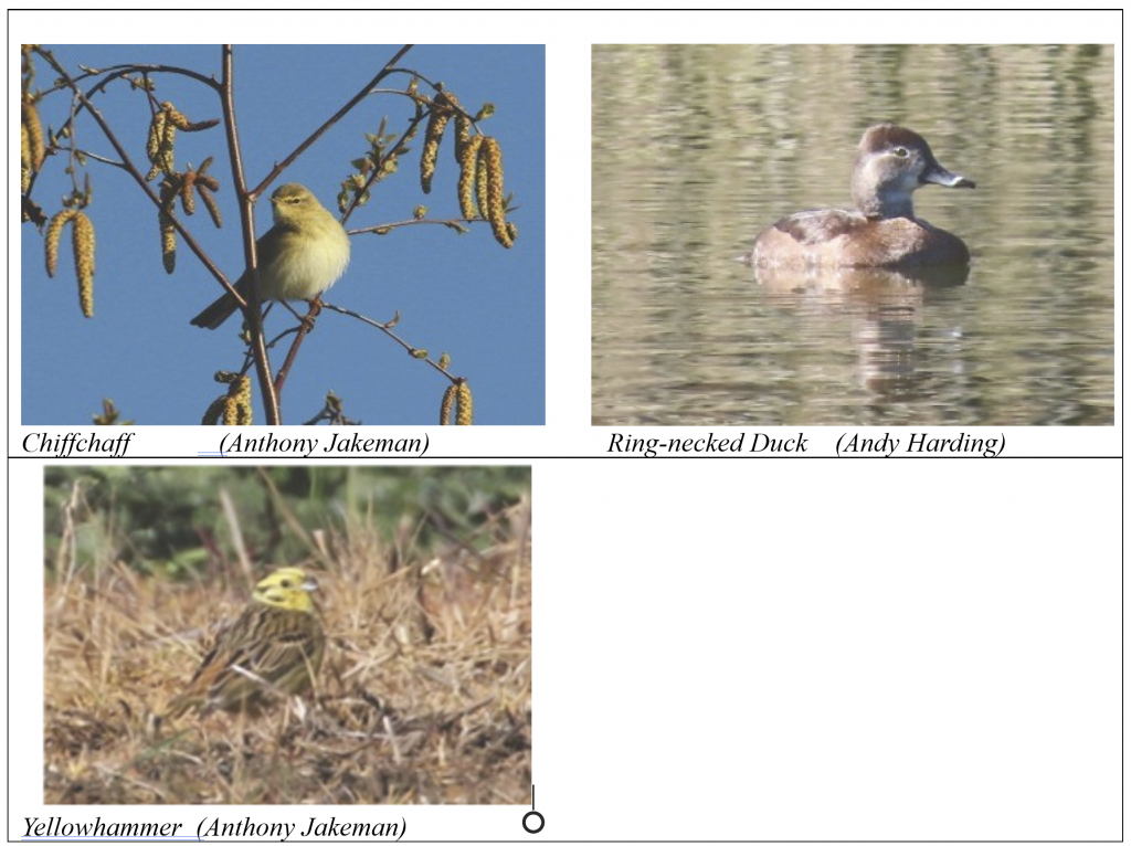 Throughout the trip a variety of commoner birds were seen and heard, including Goldfinch, Sparrow, Jay, Magpie, Linnet, Chaffinch, Starling, Great, Long-tailed, Coal and Blue Tits, Song Thrush, Robin, Blackbird, Dunnock, Wren, Pied and Grey Wagtail, Stock Dove, Herring Gull, Collared and Wood Pigeon, Canada Goose, Cormorant and Mallard. A total of 61 species was seen and/or heard.