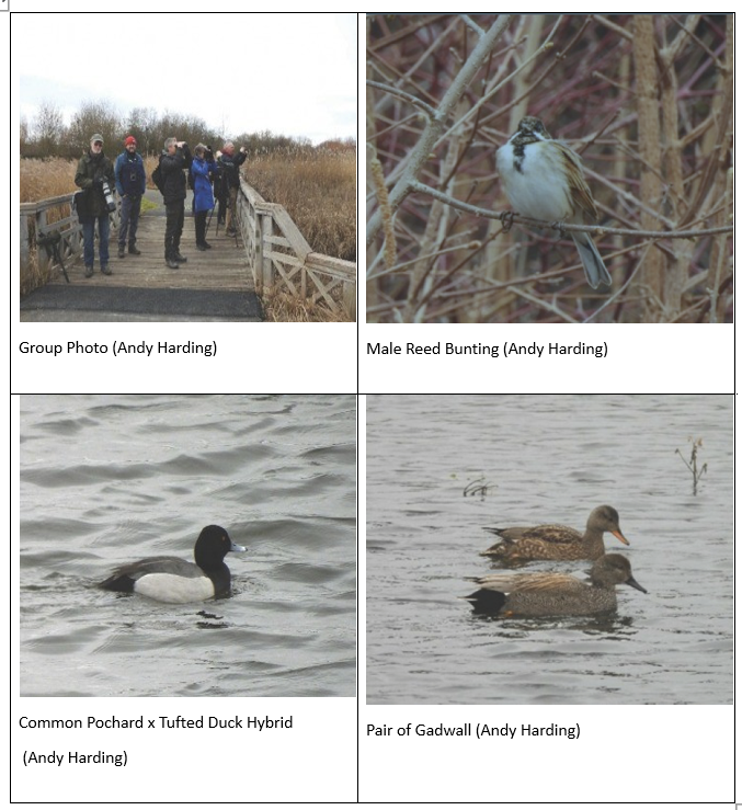 At one point the flocks were spooked by a Buzzard which was seen watching from a fence post behind the lake. Soon after, the local ‘odd-couple’ arrived (a Barnacle Goose paired with a white one) in amongst a small flock of Canada geese. We had an excellent vantage point on the raised path and several scopes to share amongst the group.