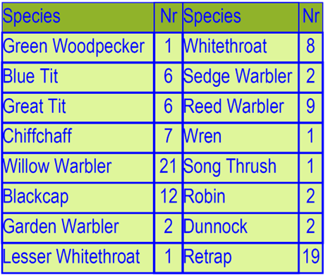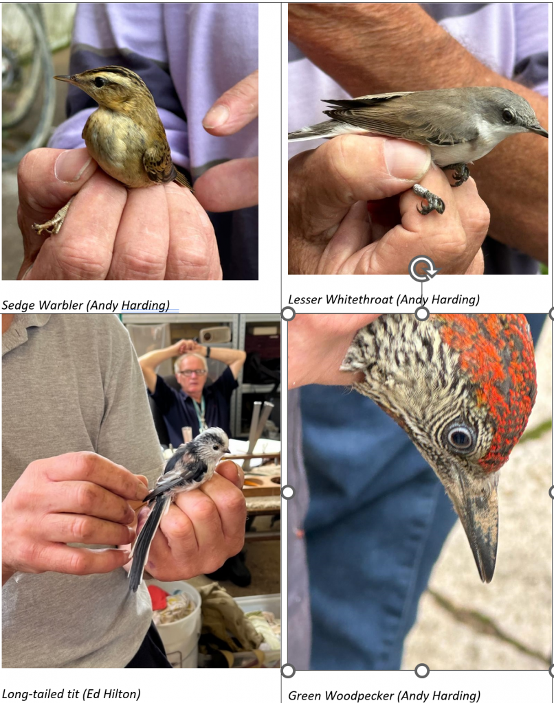 We were pleased to note that parking was available in the site itself, given that roadworks were all around the main entrance. Tony and his colleagues had kindly kept for us some choice species of birds that they had been ringing earlier that day and we were shown the birds one by one as they were taken from the capture bags and released. These included Sedge, Willow and Reed Warblers, Black Cap, Lesser and Common Whitethroats. It was astonishing to see these ‘LBJ’s up close in all their glory, and we were struck by how small they appear in the hand, compared to when seen in the field through binoculars.