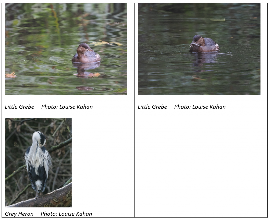 At the start of the route the usual water birds of Coot, Moorhen, Mallard are commonplace, but further along the river a greater variety is usually found – this walk produced Gadwall (male), Teal and Little Grebe (2).