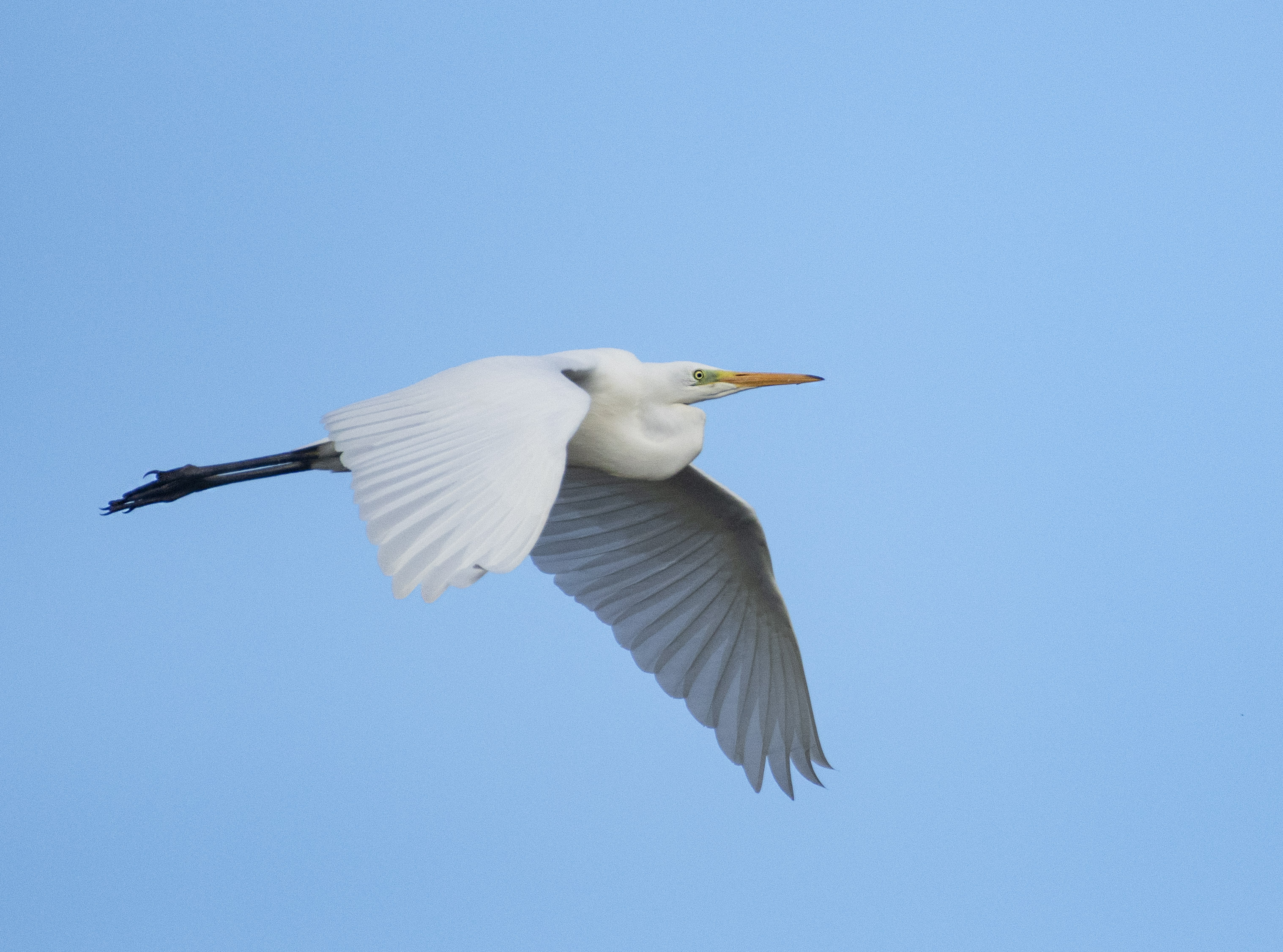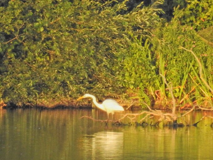Badshot Lea: Great Egret (one of the Tice’s birds) flew over Badshot Lea Ponds in evening (D Baker).