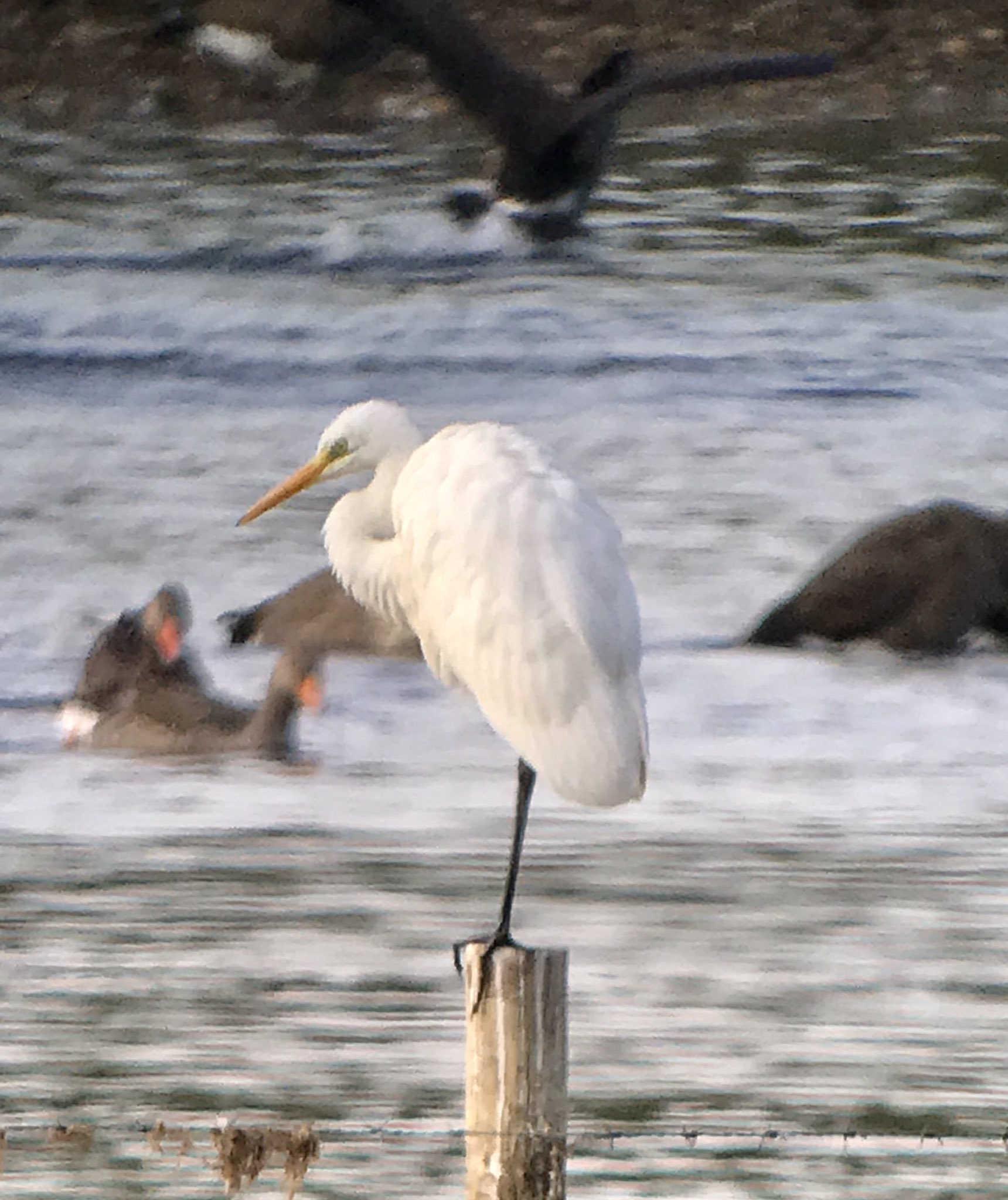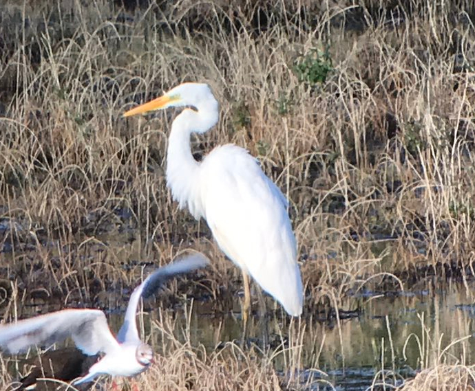 Tice’s Meadow: Great Egret, female-type Marsh Harrier over Bat Field and 2 Ringed Plovers (J Brough/TMBG).