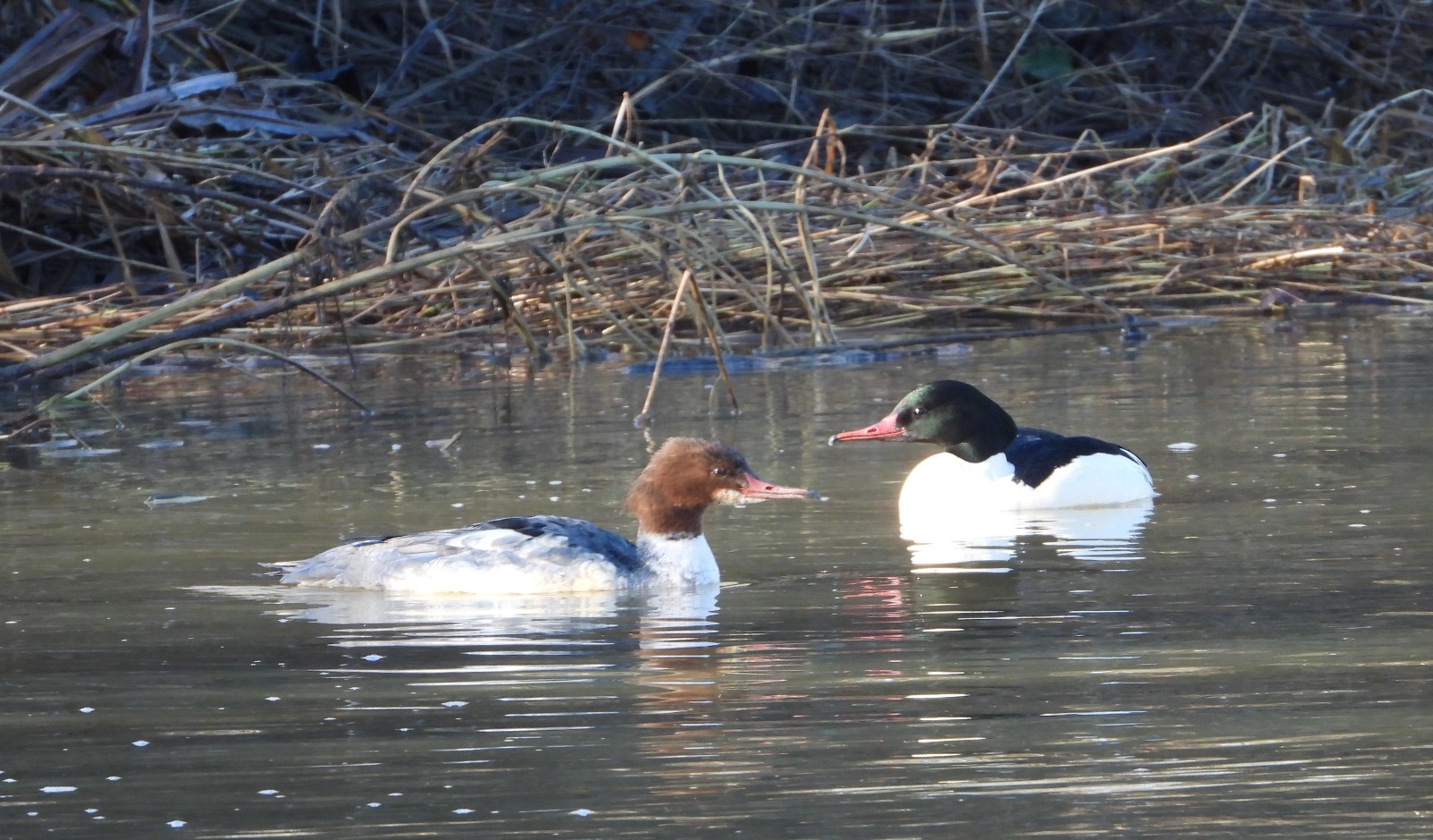 Cutt Mill Ponds: 2 redhead Goosander (D Cox).
