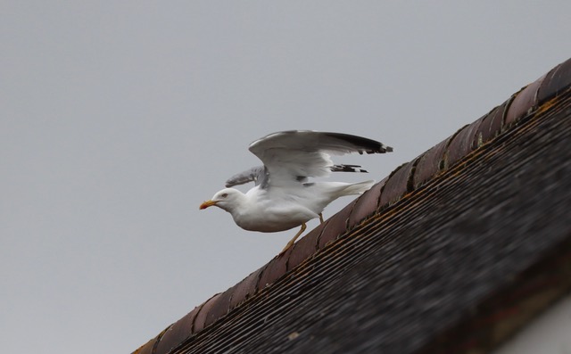 Tice’s Meadow: juvenile Mediterranean Gull on hide roof (M Scott).