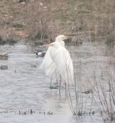 Beddington Farmlands: 2 Great Egrets north; also Sand Martin, Jack Snipe, adult Mediterranean Gull, 2 Green Sandpipers and 2 Shelduck (D Bulling/G Jones).