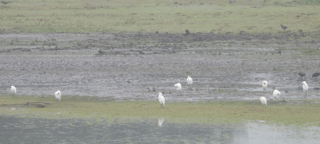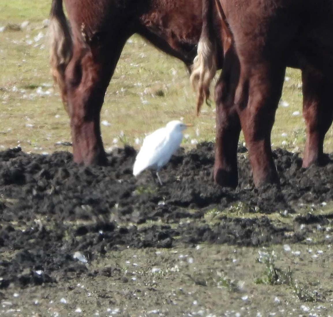 Tice’s Meadow: Cattle Egret and 3 Green Sandpipers (R Horton).